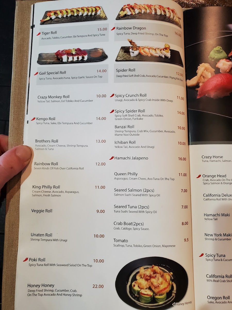Shrimp tempura, spicy crab, or unagi on top with white sauce.